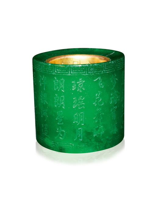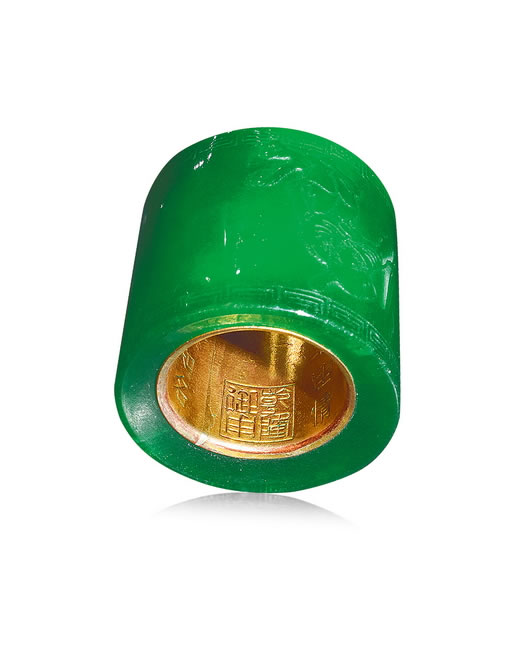 规格: H. 3.37 cm L. 3.43 cmIMPERIAL GREEN JADEITE THUMB RING Qianlong Period, Qing Dynasty