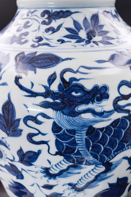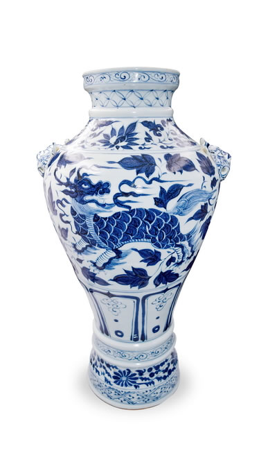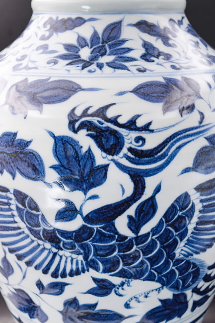 规格: H. 52.5 cm MD. 14 BD. 18 cmBLUE AND WHITE 'PHOENIX AND INTERLOCKING FLOWER' JAR WITH BEAST HANDLE Yuan Dynasty