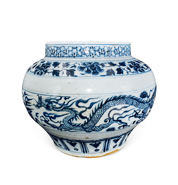 规格: H. 28 cm MD. 21.5 cm BD. 21 cmLARGE BLUE AND WHITE 'INTERLOCKING FLOWER' JAR Yuan Dynasty