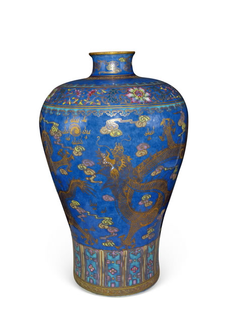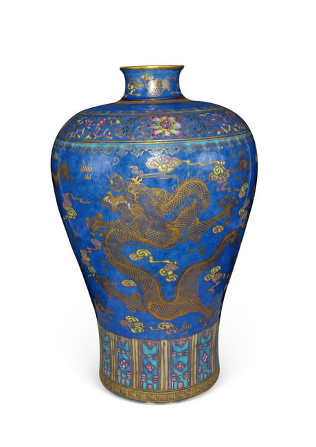 款识:大清乾隆年製款 规格:H. 27.5 cm MD. 5.1 cm BD. 11 cmBLUE-SPLASHED GILT-DECORATED 'DRAGON' PRUNUS VASE, MEIPING Qianlong Period, Qing Dynasty