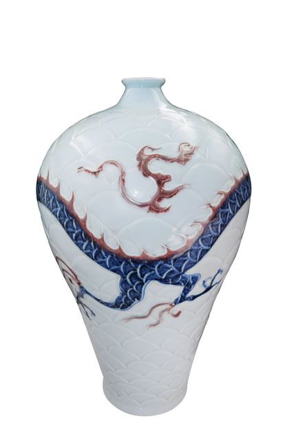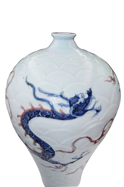 规格: H. 42.7 cm MD. 4.8 cm BD. 12.5 cmEGG-WHITE GLAZED BLUE AND WHITE COPPER-RED 'DRAGON AND WAVES' PRUNUS VASE WITH COVER, MEIPING Yuan Dynasty