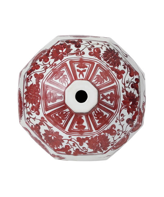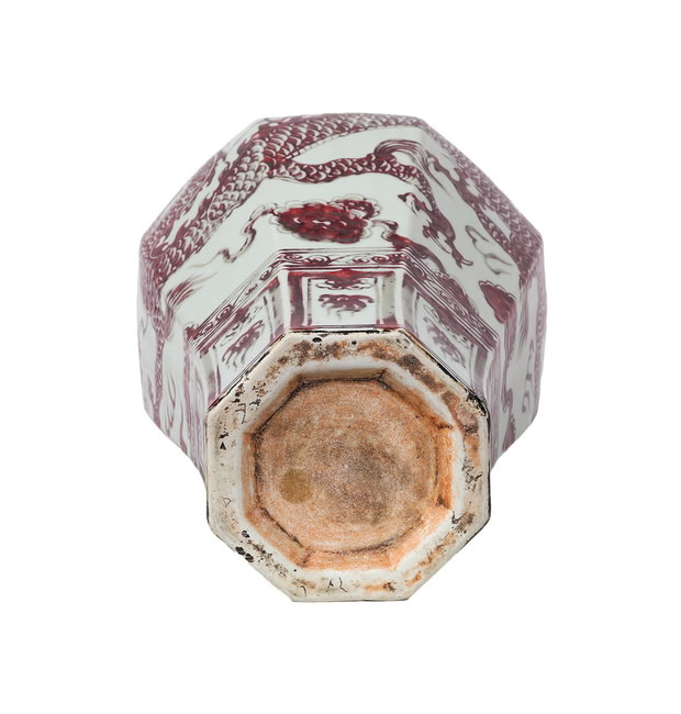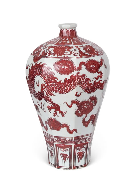 规格: H. 55.0 cm MD. 3.0 cm BD. 16.0 cmBLUE AND WHITE UNDERGLAZE COPPER-RED 'DRAGON' OCTAGON PRUNUS VASE, MEIPING Yuan Dynasty