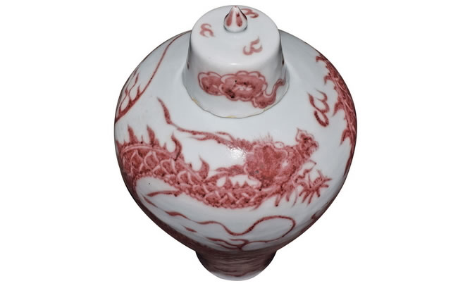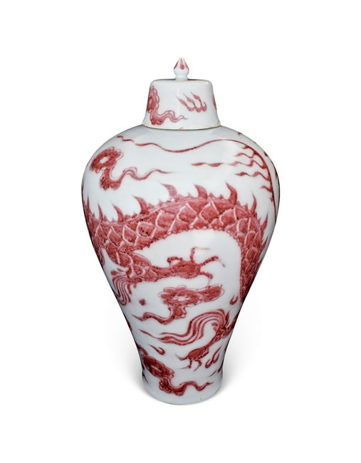 规格: H. 48.5 cm MD. 5 cm BD. 13.7 cmUNDERGLAZE COPPER-RED 'DRAGON' PRUNUS VASE AND COVER, MEIPING Yuan Dynasty