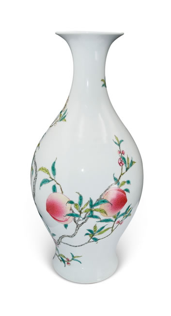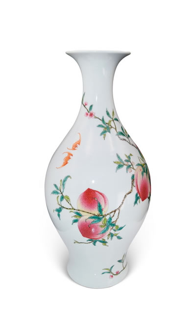 款识:大清雍正年製款 规格:H. 40 cm MD. 9.5 cm BD. 12.3 cmFAMILLE ROSE 'BATS AND PEACH' OLIVE-SHAPED VASE Yongzheng Period, Qing Dynasty