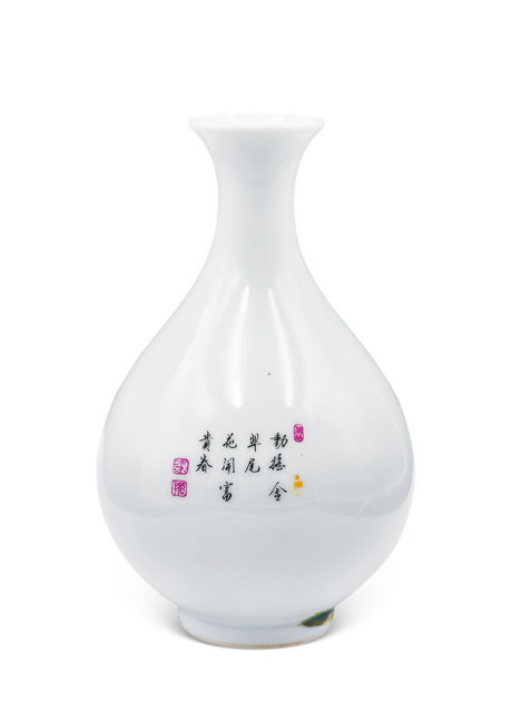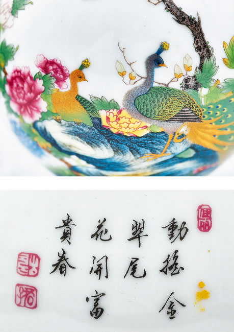 款识:大清雍正年製款 规格:H. 16.4 cmENAMELLED 'PEACOCK AND PEONY' PEAR-SHAPED VASE WITH BULBOUS BODY Yongzheng Six-Character Sealmark, Qing Dynasty