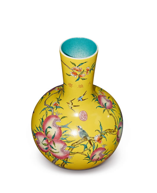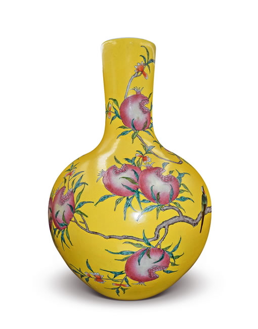 款识:永庆长春款 规格:H. 53.8 cm MD. 12 cm BD. 19.6 cmYELLOW GROUND FAMILLE ROSE 'POMEGRANATE' GLOBULAR VASE WITH CYLINDRICAL NECKMark: Yong Qing Chang Chun