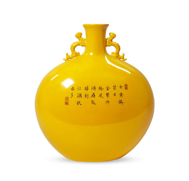 款识:雍正年製款 规格:H. 29 cmYELLOW GLAZED ENAMELLED 'QUAIL' MOONFLASK Yongzheng Period, Qing DynastyMark: Yongzheng Four-Character Sealmark