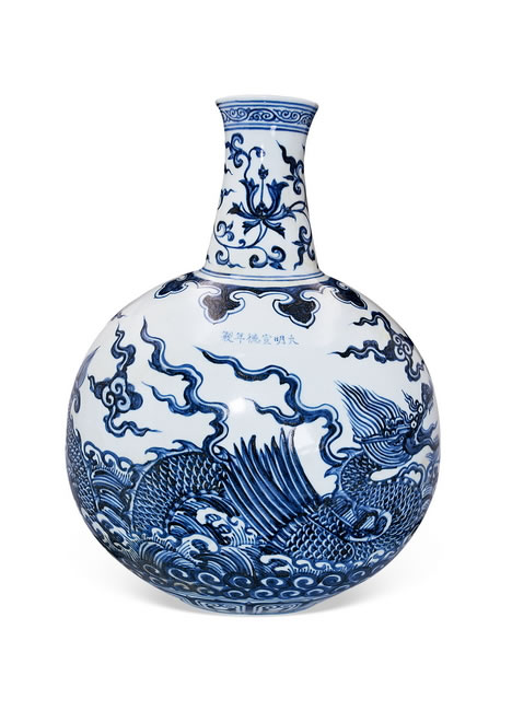 规格: H. 44.5 cmBLUE AND WHITE 'DRAGON AND WAVES' MOONFLASK Xuande Period, Ming Dynasty
