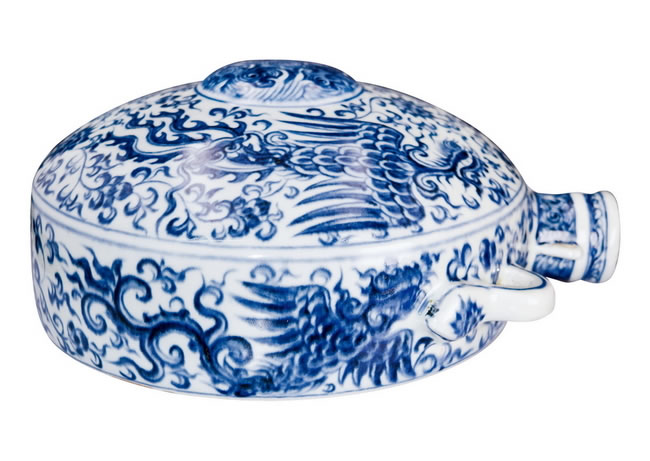 规格: 厚11.5 cm MD. 4.2 cm BD. 21.8 cmBLUE AND WHITE 'TWO PHOENIX AND INTERLOCKING FLOWER' FLAT POT Yongle Period, Ming Dynasty