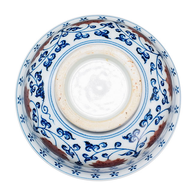 规格: H. 5.5 cm MD. 9.5 cm BD. 4.5 cmA PAIR OF BLUE AND WHITE UNDERGLAZE COPPER-RED 'INTERLOCKING LOTUS' CUPS Yongle Period, Ming Dynasty