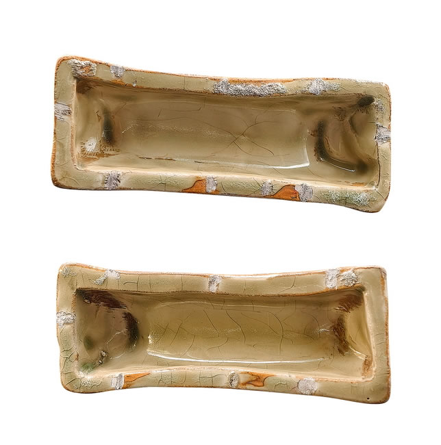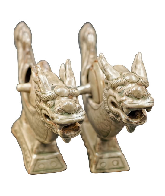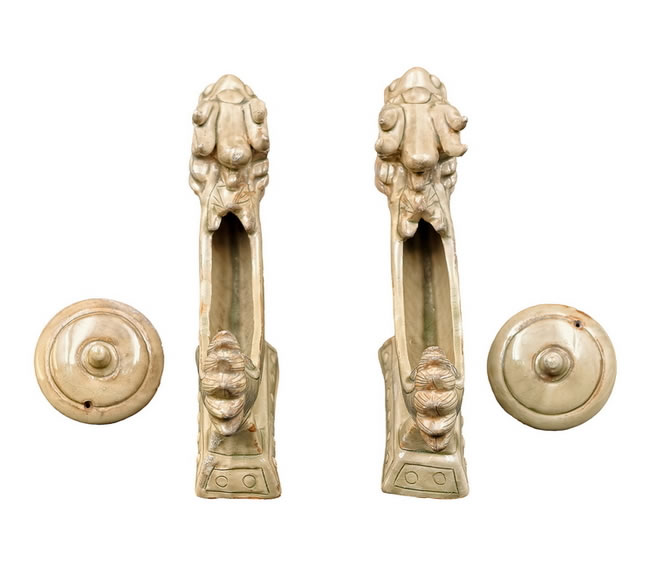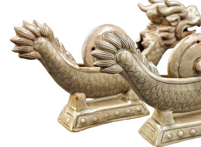 规格: H. 12.5 cm L. 22 cm BD. 9.5 cm×3.5 cmA PAIR OF PORCELAIN ROLLER IN DRAGON SHAPED, NIAN Five Dynasties