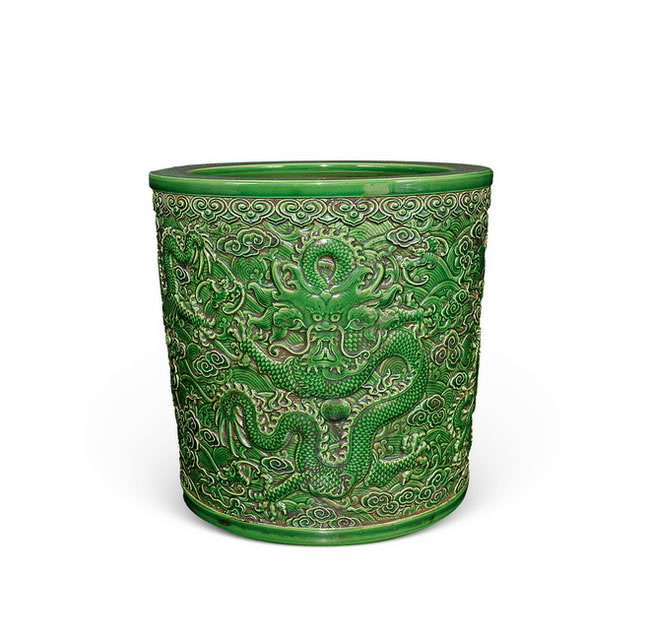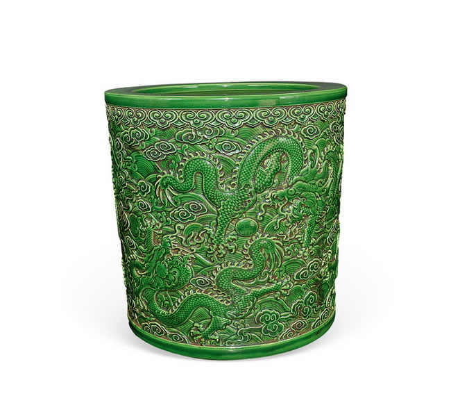 款识:大清乾隆年製款 规格:H. 25 cm MD. 25 cm BD. 23 cmAPPLE-GREEN GLAZED 'DRAGON' BRUSH POT Qianlong Period, Qing DynastyMark: Qianlong Six-Character Sealmark