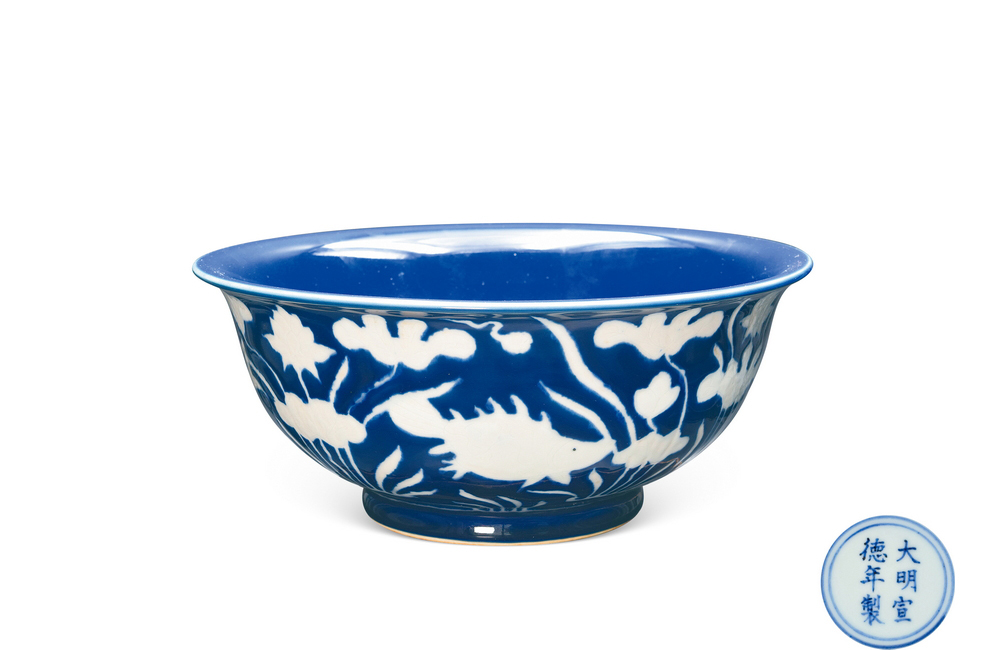 LARGE SKY-CLEARING BLUE GLAZED 'WATERWEEDS' BOWL Ming DynastyXuande Period, Ming Dynasty