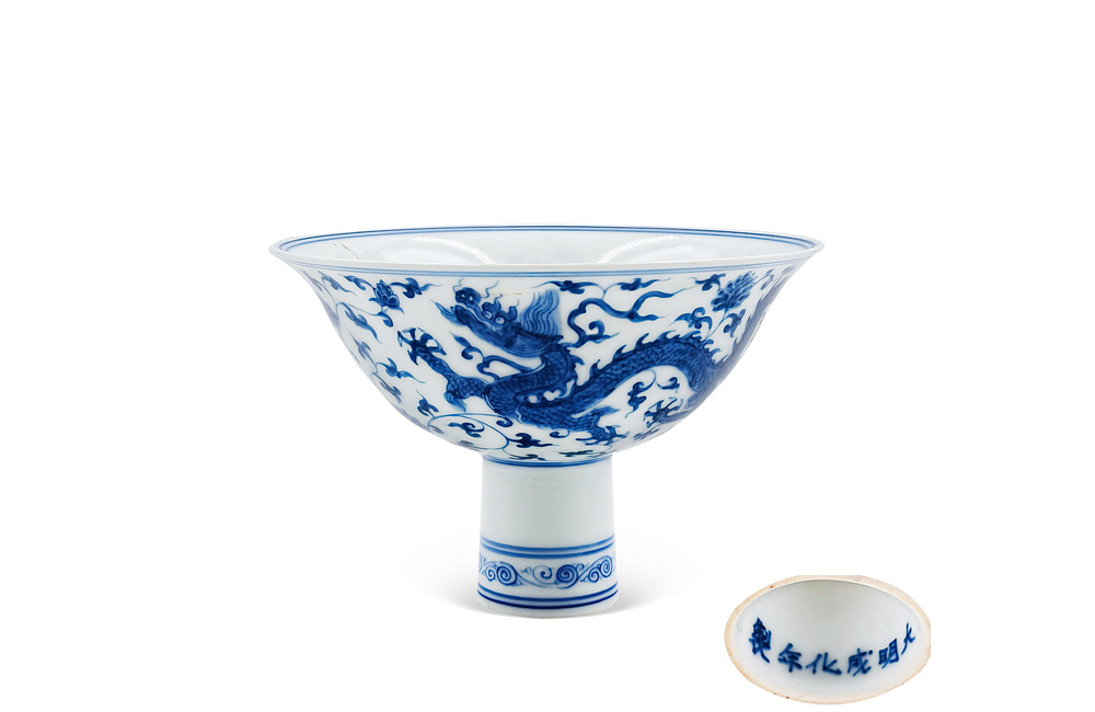 BLUE AND WHITE ‘DRAGON THROUGH FLORAL’ STEM-BOWL Chenghua Period, Ming Dynasty
