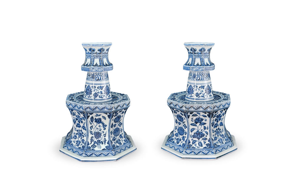 A PAIR OF BLUE AND WHITE 'FLORAL' OCTAGONAL CANDLESTICKS Yongle Period of Ming Dynasty