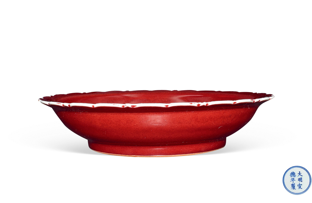 202501_552 霁红釉青花鱼藻纹棱口盘 明宣德
