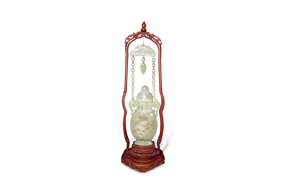 202501_498 和田玉如意双耳吊双链盖瓶(连座) 清代