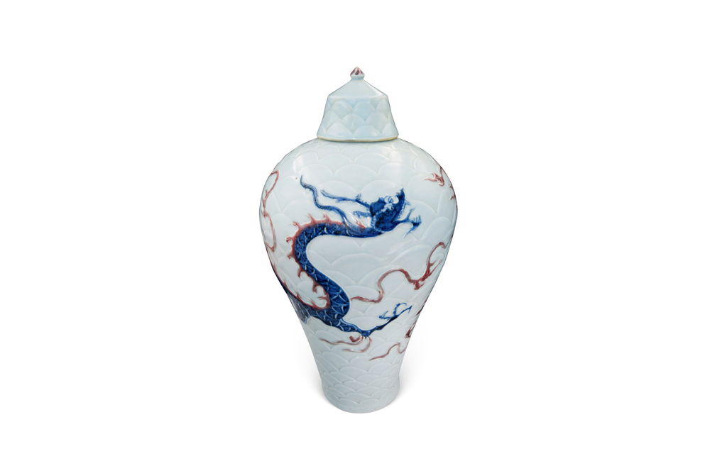 202501_232 卵白釉青花釉里红海水龙纹梅瓶(有盖) 元代