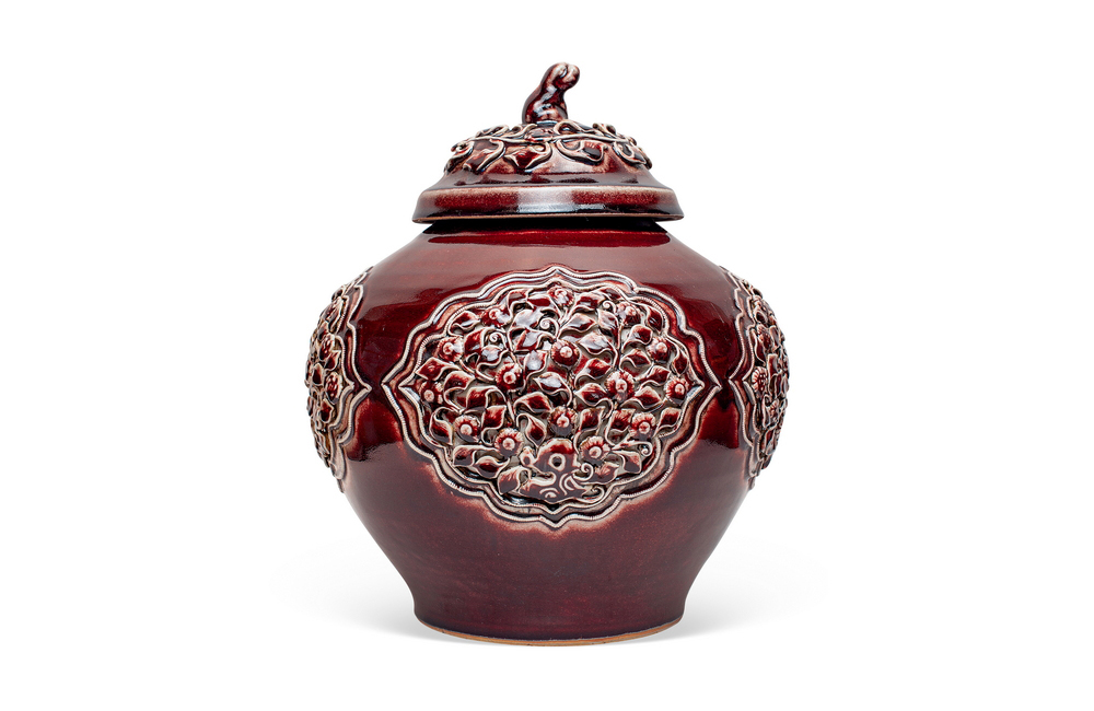 202501_201 祭红釉开窗捏花狗头盖罐 元代