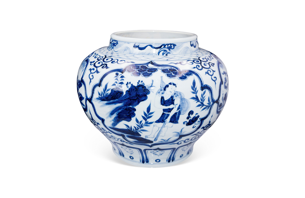 202501_193 青花人物故事四面开窗大罐 元代