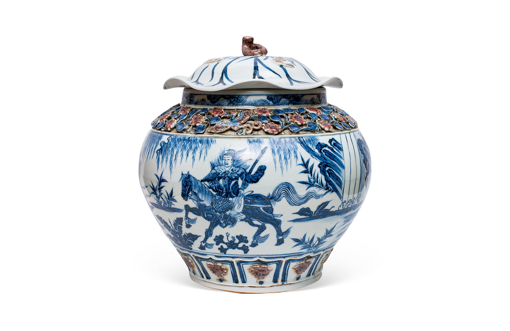 202501_196 青花釉裹红捏花人物故事纹荷叶盖罐 元代