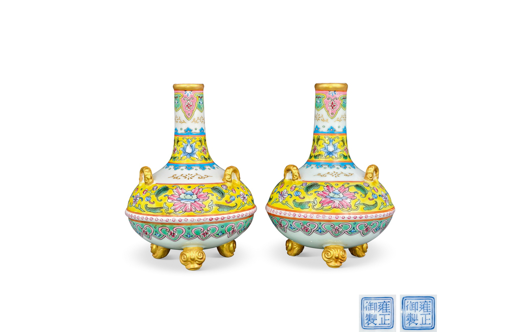 202501_478 黄地珐琅彩如意花卉纹鼎式炉(一对) 清雍正