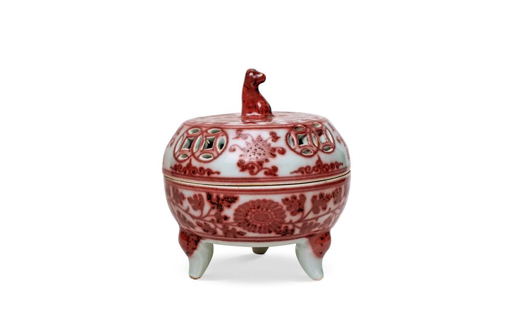202501_481 釉里红缠枝花卉纹兽钮三足香薰 明洪武