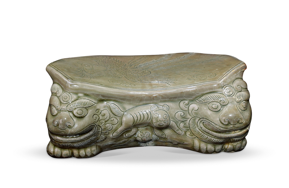 202501_338 越窑秘色瓷錾刻凤凰对虎子纹瓷枕 五代