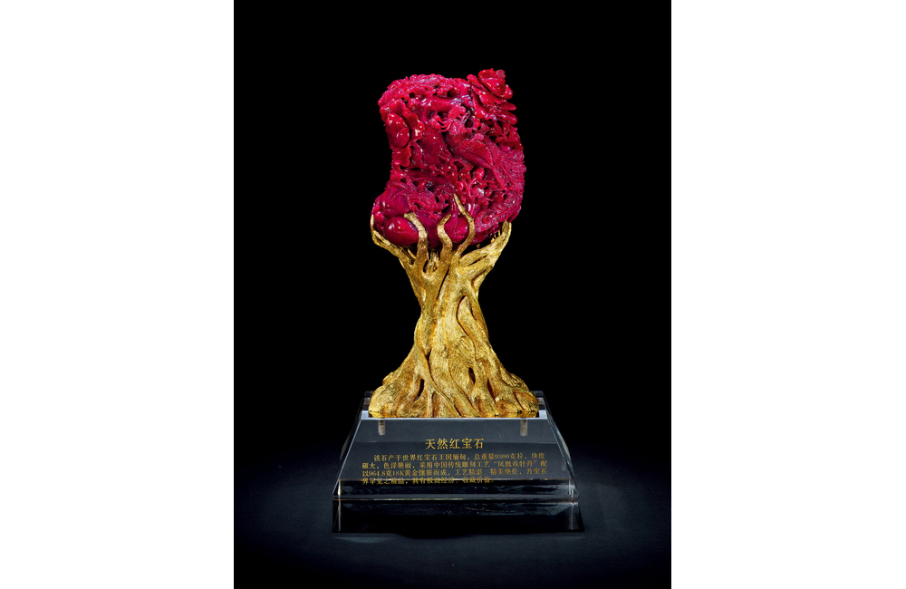 202501_070 金镶天然红宝石凤凰戏牡丹摆件