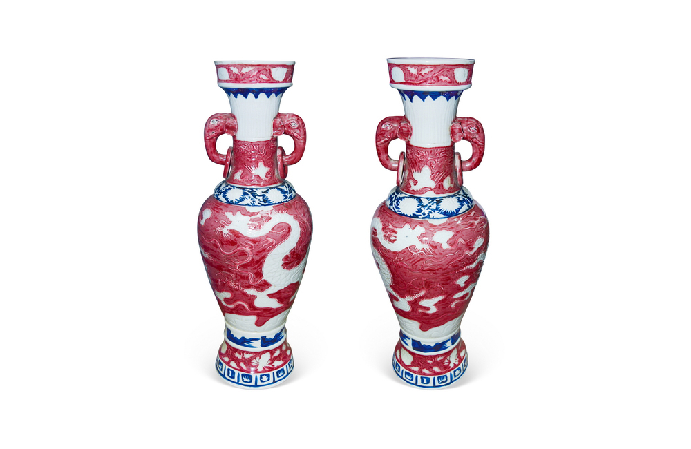 202501_379 青花釉里红留白龙纹耳瓶(一对) 元代