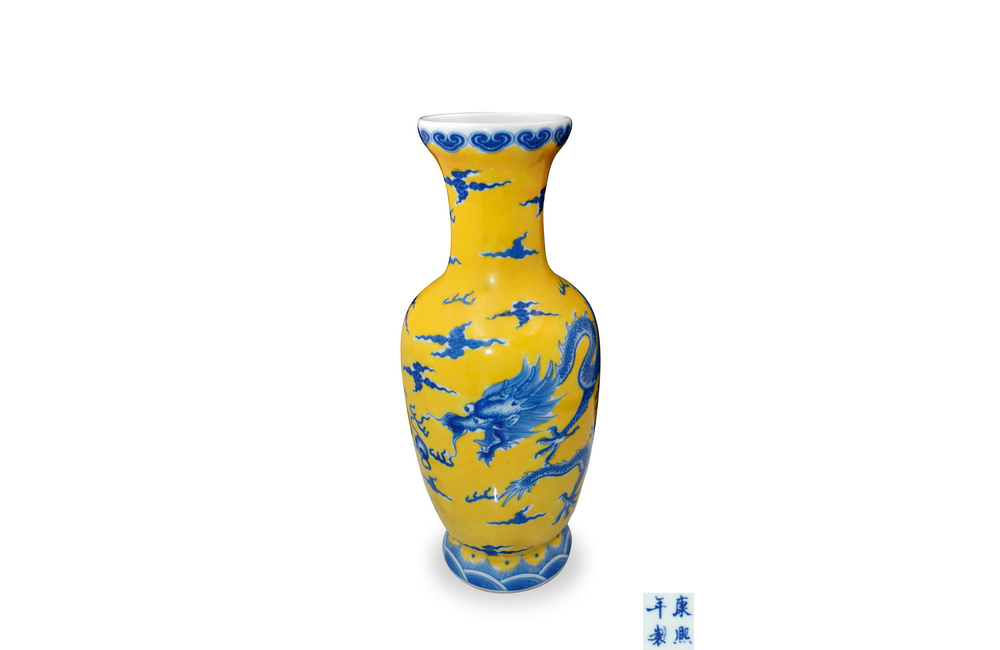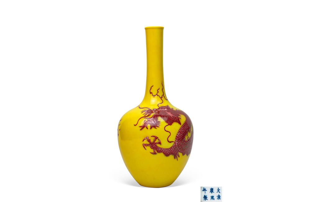 202501_372 黄釉釉里红云龙戏珠长颈瓶 清康熙