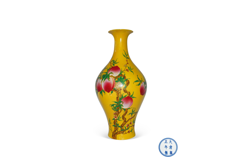 202501_367 黄地粉彩寿桃纹橄榄瓶 清雍正
