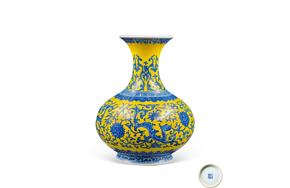 202501_359 柠檬黄地青花缠枝龙纹赏瓶 清乾隆