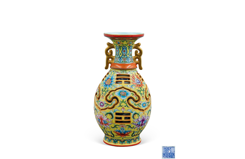 202501_362 珐琅彩镂空黄地花卉纹双耳转心瓶 清乾隆