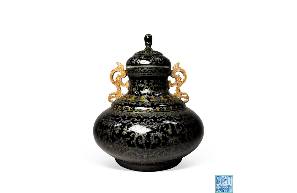 202501_363 黑地描金福寿纹双龙耳荸荠盖瓶 清乾隆