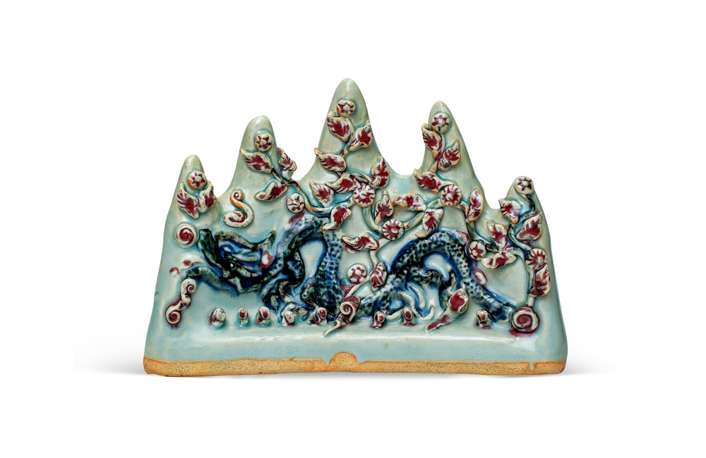 202501_352 青花釉里红寿山式雕山花龙麒麟纹笔架 元代