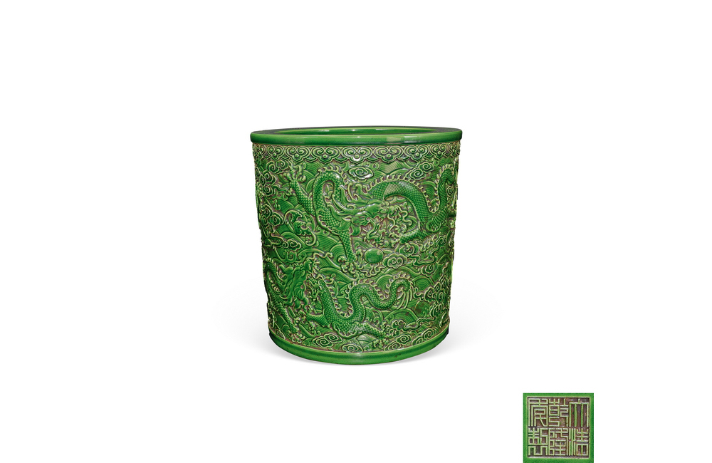 202501_321 苹果绿雕刻龙纹笔筒 清乾隆