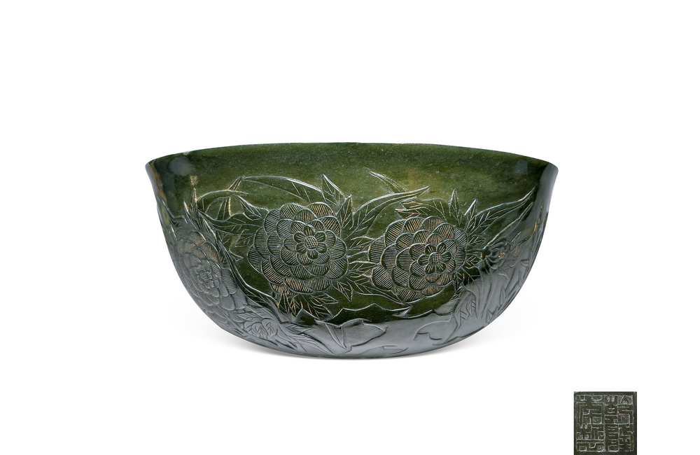 202501_443 和田碧玉浮雕梅兰竹菊御诗文大海碗 清乾隆